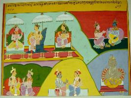 | Description / विवरण | Miniature painting based on Sarangatattva - an independent work of Sankhya school of philosophy depicting Yudhisthir sitting with his brothers in a court in the upper right part. To the left he is shown sitting with Krishna and asking his advice. At the lower right, he is talking to his brother. At the lower left side a ten headed man with twenty arms is sitting in Padmasana. |