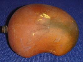 | Description / विवरण | Life size model of a mango with a short, three tiered stem. It is made of light weight wood and painted in reddish brown colour with a hint of green at the bottom. |