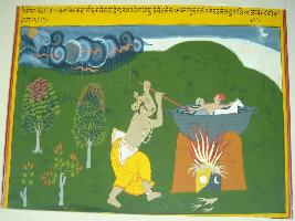 | Description / विवरण | Miniature painting based on Sarangatattva - an independent work of Sankhya school of philosophy depicting the scene of hell that a man who has done sin in his life time will be punished after this life. This painting depicts a man, probably Yamraj, boiling and steering sinners in his pan. At the top, clouds are shown with lighting and sun is also visible. |