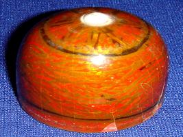 | Description / विवरण | Dome shaped, wooden dice painted with lacquer paint having floral designs and a round base of red colour. At the top of the dice there is a tiny ivory fitting. |
