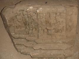 | Description / विवरण | Sculptured architectural fragment depicting four armed female deity in Lalitasana. On her left two female attendants while on right, four female attendants are visible. |