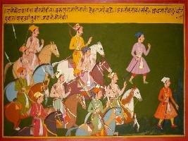 | Description / विवरण | Miniature painting based on Prithviraj Raso depicting a scene of marching of Birmohil, Barun, Devraj fully armed by bow, arrow and Bhala, followed by other chiefs. |
