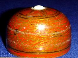| Description / विवरण | Dome shaped wooden dice painted with lacquer paint, having floral designs and a round base of red colour. At the top of the dome there is a tiny ivory fitting. |