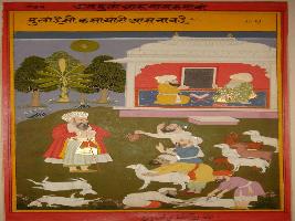 | Description / विवरण | Miniature painting based on Mullah-do-Piyaja depicting Mullah-do-Piyaja telling Akbar that a Mullah do not kill animals like a butcher. |