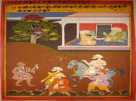 | Description / विवरण | Mullah and Akbar when Mullah says that the poor men are always asking for money by saying that they are poor. In the painting a noble is seen on horseback followed by three men and a poor man is asking him for money. |