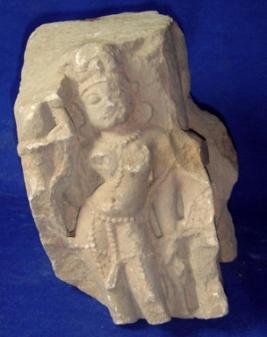 | Description / विवरण | Independent sculpture of a female attendant in standing position. Her breasts and legs below knees are chopped off. She is holding a lotus in her right hand which is partially broken and the tussels of her drapery with her left hand. |