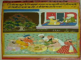 | Description / विवरण | Miniature painting depicting Akbar and Mullah-Do-Piyaja, on the lower part a treat scene is depicted, and many peoples taking part in it. |