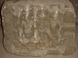 | Description / विवरण | Sculptured architectural fragment depicting Brahma. Attributes from below 1 not clear, 2 not clear, 3 manuscript, 4 kamandal. On the left side one male dancer is depicted. |