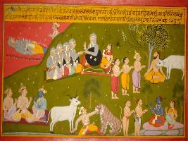 | Description / विवरण | Miniature painting based on Prithviraj Raso. It praises and compares Prithviraj with great heroes. Four nobles are depicted talking to Prithviraj in centre. On each corner Bhishma is depicted sleeping on the bed of arrows. Krishna talking to two people, Hanuman worshipping Ram and Sita and Indra giving a cow to a sage is also depicted. |