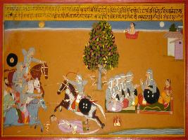 | Description / विवरण | Miniature painting based on Prithviraj Raso depicting Samantas talking to king of Panga kingdom. Samantas saying that they want to go to Delhi and in the battle if they lost their lives that will increase the glory of Panga king. |