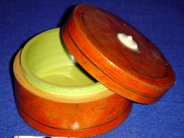 | Description / विवरण | Circular wooden box with lid. The lid has a small circular, ivory fitting in the centre. The box has floral pattern in golden lacquer paint on scarlet base. |