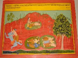 | Description / विवरण | Miniature painting based on Mahabharat - Vana parva depicting Bhima s fight with demon Hidimb and Bhim killed him. Later female demon Hidimba , sister of Hidimbis coming to Bhim. |