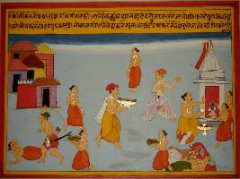 | Description / विवरण | Miniature painting based on Kashi khand depicting pundits and Brahmans worshipping Shiv linga in left part. In right part, a man is depicted beating a Brahman and 2 persons carrying something in their hands. |