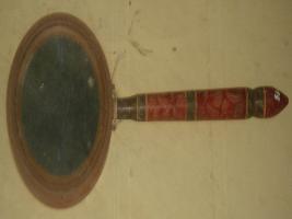 | Description / विवरण | A circular mirror in a wooden frame with wooden handle. The handle has a green and red colour strip with white coloured flowers painted on it. |