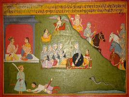| Description / विवरण | Miniature painting based on Prithviraj Raso depicting Panga telling his Samants about the earthly life created by Brahma, about Dharma and Adharam and about sadness and happiness in the life of human being. |