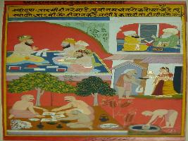 | Description / विवरण | Miniature painting based on Mullah-do-Piyaja. It depicts on the upper left Mullah-do-Piyaja talking to Akbar. At the upper right side four men are talking about manuscripts. It also depicts the mind of beggar also distracted sometimes by seeing beautiful women. |