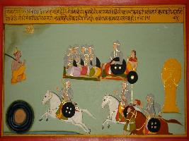 | Description / विवरण | Miniature painting based on Prithviraj Raso depicting poet Chandvardai telling the Samants that if the Meru mountain shakes, if Dhruv star changes its position, if all seven seas shake, if power of Kaal decreases, if moon looses its light and if brightness of sun decreases then only Prithviraj will flee from Panga. |