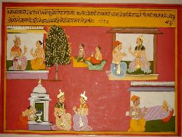 | Description / विवरण | Miniature painting based on Kashi khand depicting of Kalinga achieving kingdom of Kubera, by serving his father, worshipping Shiv. At the upper right side Indra is depicted talking to a devpurush. |