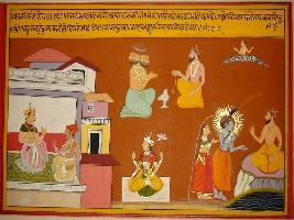 | Description / विवरण | Miniature painting based on Kashi khand depicting at the right part a king talking to a man. Next to them towards left a four armed devi is depicted holding a lotus in one hand. Next to it Mahadev and Parvati is depicted giving boon to a sage. At the upper centre, a sage is worshipping Shiv, in front of whom a multiheaded man is depicted. At the upper left corner man is coming, sitting on clouds. |