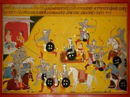 | Description / विवरण | Miniature painting based on Prithviraj Raso depicting when king Panga does not listen to his Samants, then Samants going back to their own forces and started fighting against the king. Then Man Yadav telling Kanha that now onward king is not in their favour. |