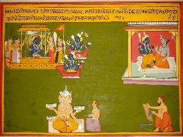 | Description / विवरण | Miniature painting based on Kashi khand depicting at the upper left side ganas telling Shivsharma who is on a Vahan with four female attendants that at the time Mahadev and Vishnu are in conversation depicted at the upper left side. At the lower part Brahma is depicted with his son. Next to them a sage is depicted. |