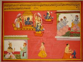 | Description / विवरण | Miniature painting based on Kashi khand depicting Shivsharma going to his lok in his yaan and on his way, he sees Shivlok with Shiv sitting with Shiv gana. At the lower left, a man is worshipping linga, to its right he is shown meditating. At the lower right, Indra lok is depicted with Indra is sitting. |