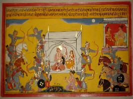 | Description / विवरण | Miniature painting based on Prithviraj Raso depicting the first night of marriage life of Prithviraj and Sanjogita where a Samant namely Jaman asks his king that he should go and sleep with Sanjogita and does not need to worry about enemy. |