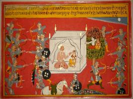 | Description / विवरण | Miniature painting based on Prithviraj Raso depicting Prithviraj looking at the beauty of Sanjogita, surrounding him his army fighting with the army of Panga king. |