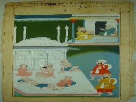 | Description / विवरण | Miniature painting based on Mullah-do-Piyaja depicting on the upper left Mullah-do-Piyaja talking to a man. It also depicts two men coming to a place where old men lives. This painting is incomplete. |