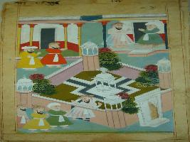 | Description / विवरण | Miniature painting based on Mullah-do-Piyaja depicting at the lower part Mullah-Do-Piyaja instructing a person who is coming inside the palace. On the left top Mullah-do-Piyaja is talking to a man and two men at the left side honouring them. Part of palace is also depicted. This painting is incomplete. |