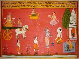 | Description / विवरण | Miniature painting based on Kashi khand depicting lord Brahma ridding on a chariot on the right hand side of the painting. On the left hand side there is depiction of Chandrama worshipping Shiv. |