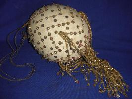 | Description / विवरण | Ornamented Ostrich egg, decorated with Salma sitara work all around, hangings at the lower end, and a string on the upper end to hold it. |