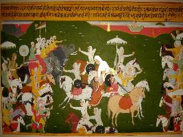 | Description / विवरण | Miniature painting based on Prithviraj Raso depicting Prithviraj on horse back with his few army eloping Sanjogita. He is surrounded by the army of Panga king, and the army taking round of Prithviraj in the way Devtas taking round of Meru mountain. |