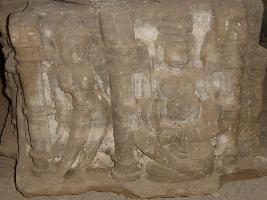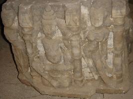 | Description / विवरण | Sculptured architectural fragment of a lower portion of a pillar depicting in one side Kuber four armed. Attributes from right below varada mudra, pash, but not clear. He is seated in lalitasana and wearing mukuta, necklace anklet and sacred thread. He is flanked by two female attendants. On the other side a four armed male deity is depicted flanked by one attendant. |