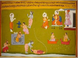 | Description / विवरण | Miniature painting based on Kashi khand depicting Shiv making Chandrama free from the curse of Daksh-Prajapati. |