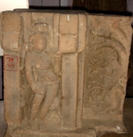 | Description / विवरण | Sculptured architectural fragment- part of a pillar depicting a female chauri bearer in standing position in pillared niche. Her left hand is in Kartavyalambit pose. Her face and right breast are mutilated. To her left a peacock and floral designs are seen. |