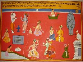 | Description / विवरण | Miniature painting based on Kashi khand depicting Shiv and Chandra in standing from on the top right part of the painting, painting depicts different types of Shiv worship. |