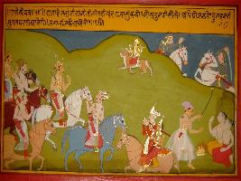 | Description / विवरण | Miniature painting based on Prithviraj Raso depicting Prithviraj want to met goddess Bhavani and Chandvardai says that it is the good time to marry Sanjogita. |