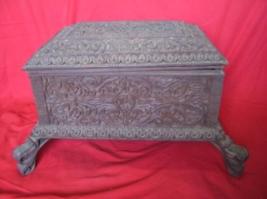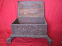 | Description / विवरण | Wooden box with four curved legs. It have bold fashioned labyrinthic floral patterns carved all over. The sides four sides have indented borders. While the cover and the lower curved support have floral patterned borders. |