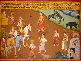 | Description / विवरण | Miniature painting based on Prithviraj Raso depicting Prithviraj marching through a jungle which is full of wild animals. |