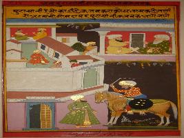 | Description / विवरण | Miniature painting based on Mullah-do-Piyaja depicting Mullah saying to Akbar that the anger of Surasevi people is like a goat and who always tortured the Uzbek people. In the painting a man is hitting a man by chabuk. |