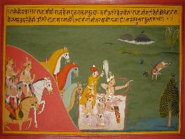 | Description / विवरण | Miniature painting based on Prithviraj Raso depicting Prithviraj going for hunting along with his attendants and get down from the horse, seated on mat and hunt a deer. |