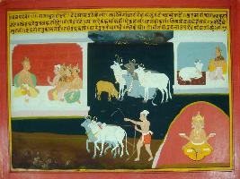 | Description / विवरण | Miniature painting based on Mahabharat - Vana parva depicting Vedvyas is talking to Raja Dhritrashtra is shown sitting with his sons at upper right part a man is shown plough on field. Above this bunch of cows is depicted Surbhi is shown going to king Indra at upper left part. Brahma is depicted sitting below this. |