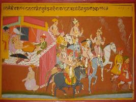 | Description / विवरण | Miniature painting based on Prithviraj Raso depicting along with her army going for Raj Surya sacrifice in night. |