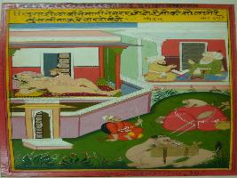 | Description / विवरण | Miniature painting based on Mullah-do-Piyaja depicting Mullah and Akbar where Mullah says that every body is not free from physical desire where on top a loving union seen and in the lower part a camel and monkey is seen. |