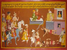 | Description / विवरण | Miniature painting based on Prithviraj Raso depicting while king Savant marching he reached a village where he saw dreamful play by Natas and become sad. |