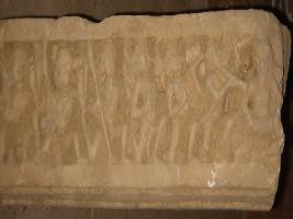 | Description / विवरण | Sculptured architectural fragment probably of a lintel depicting musicians holding different musical instruments and fighting scenes fighters holding sword and shields and one horse. |