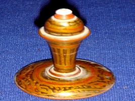| Description / विवरण | Wooden chessman-black bishop, with long body and circular base. The top has a small ivory fitting in the centre. It has been decorated with designs in golden, black and scarlet lacquer colours. |