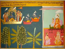 | Description / विवरण | Miniature painting based on Kashi khand depicting Shivsharma moving towards Budhalok. Ganas told him that Budha is son of Chandrama and grandson of Trinity, who is son of Brahma. |