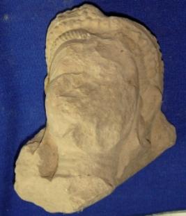 | Description / विवरण | Female head with elaborate headgear but partly flaked off. Her face is rubbed out. |